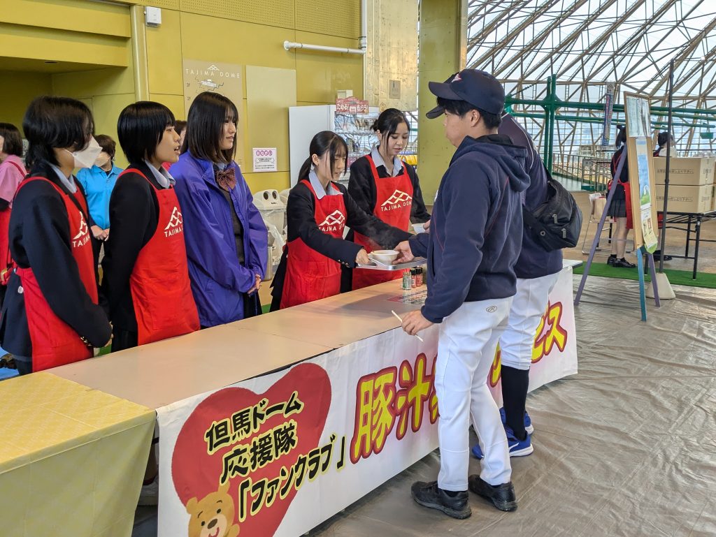 入場無料です。恒例の但馬ドーム応援隊『ファンクラブ』による温かい豚汁の無料サービスなども行いますので、是非、お誘い合わせのうえ観戦にお越しください。