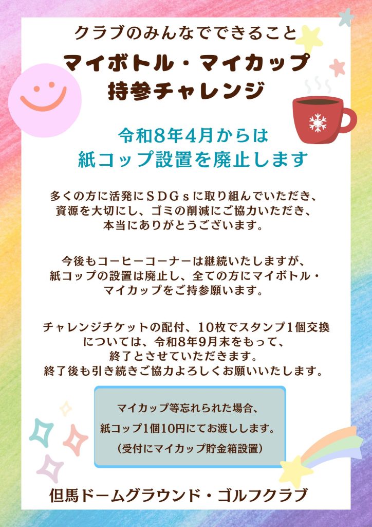 これまで実施してきた「マイボトル・マグカップチャレンジ」、いよいよ4月から紙コップ設置を廃止し、すべての会員方にマグカップ等を持参していただき、エコ活動にご協力をお願いいたします。
