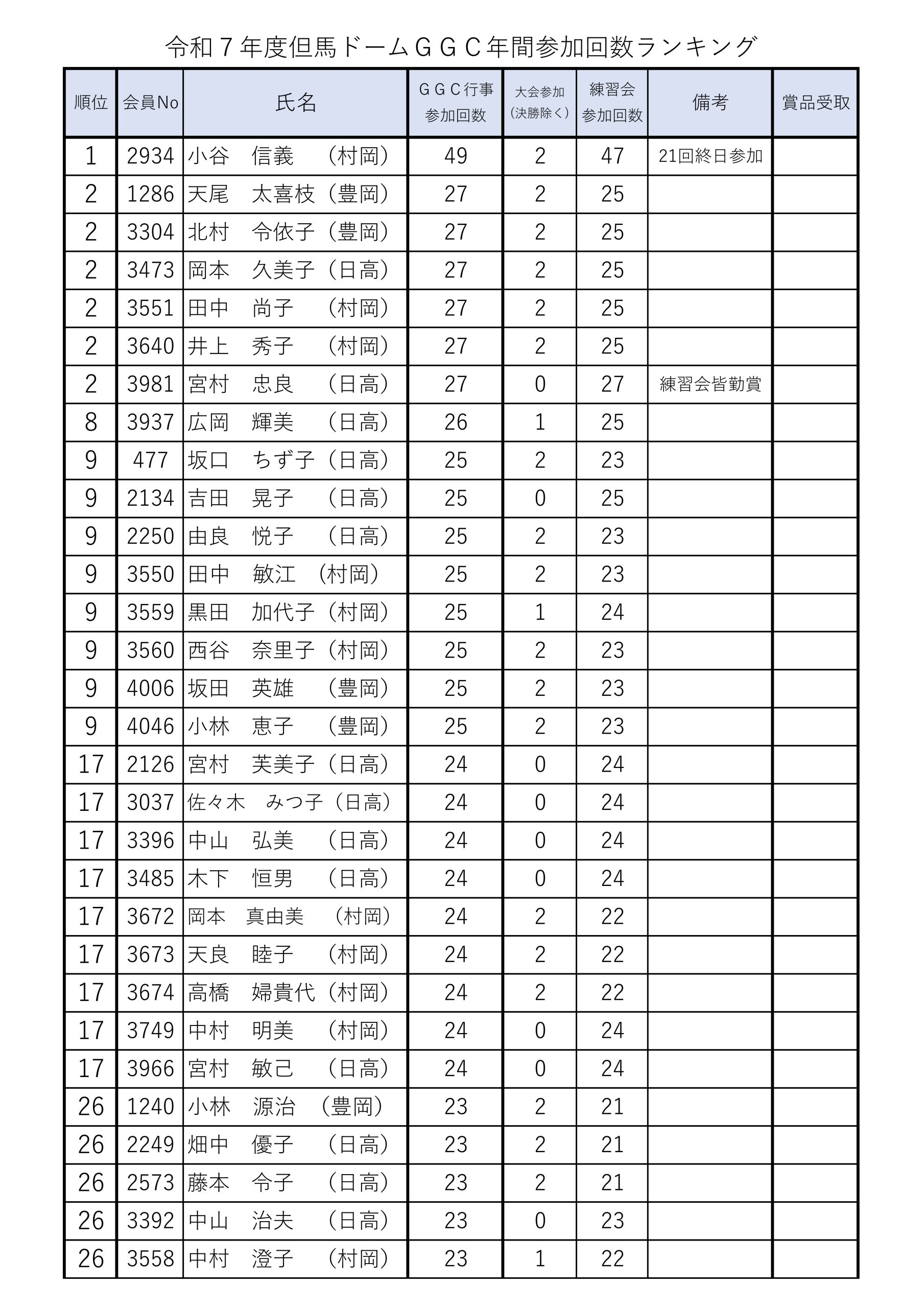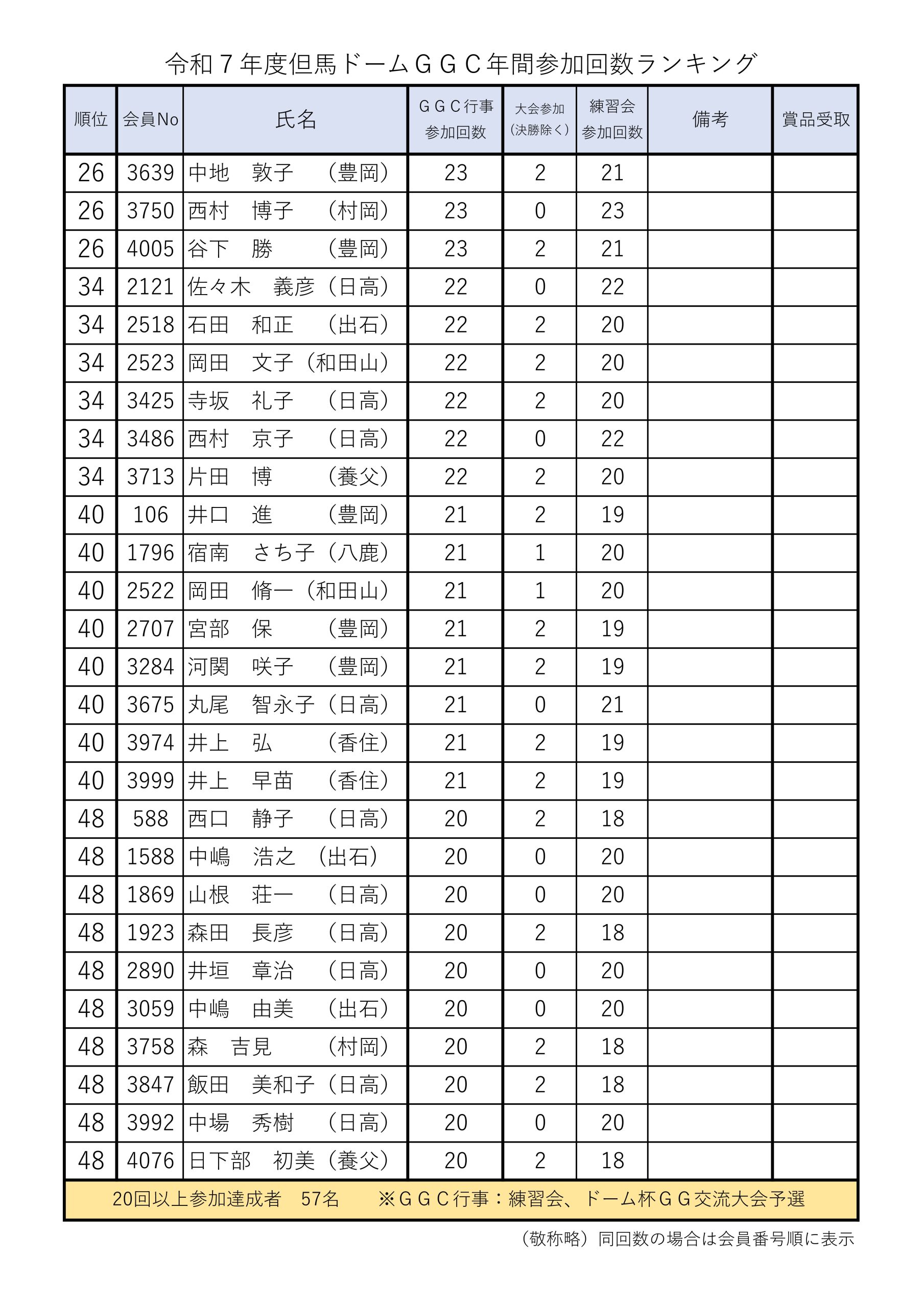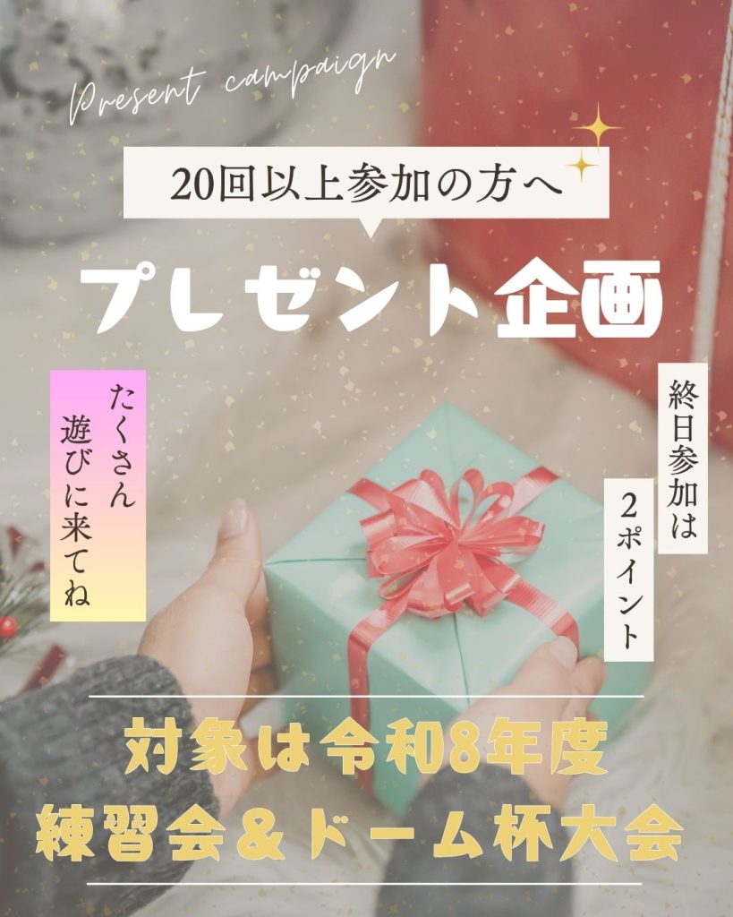 そして、4月以降の練習会にて、7年度の当クラブ練習会、大会あわせて参加回数が20回以上の方にプレゼントを贈呈します。