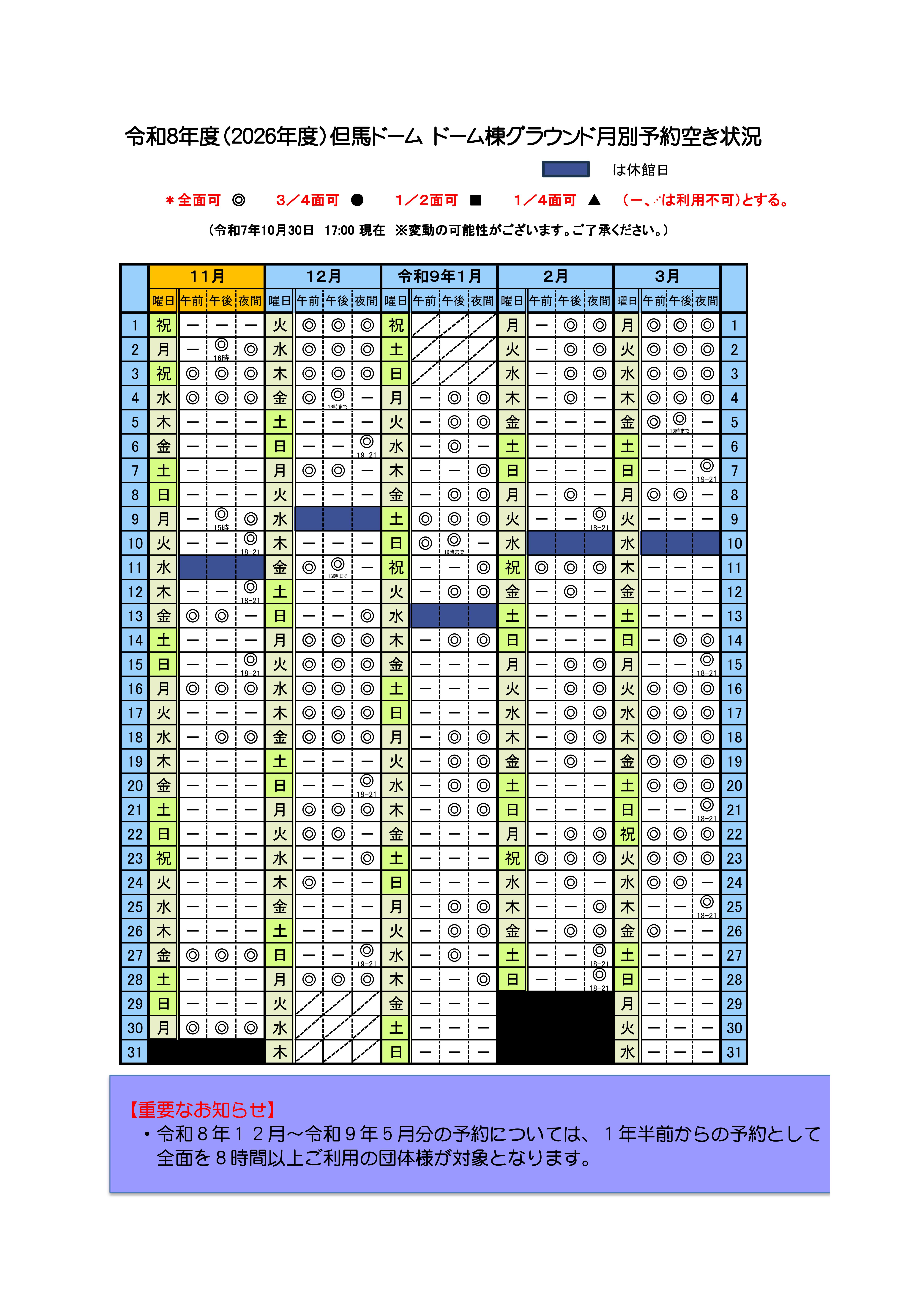 【令和7年11月~令和8年11月 ドーム棟グラウンドの空き状況】