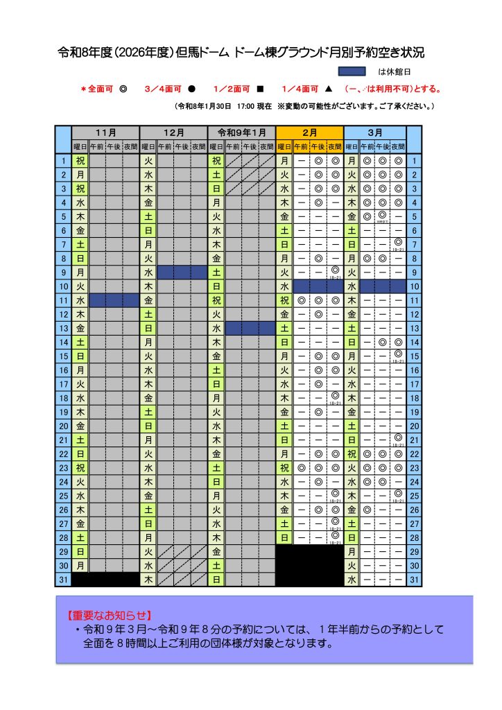 【令和8年2月~令和9年2月 ドーム棟グラウンドの空き状況】