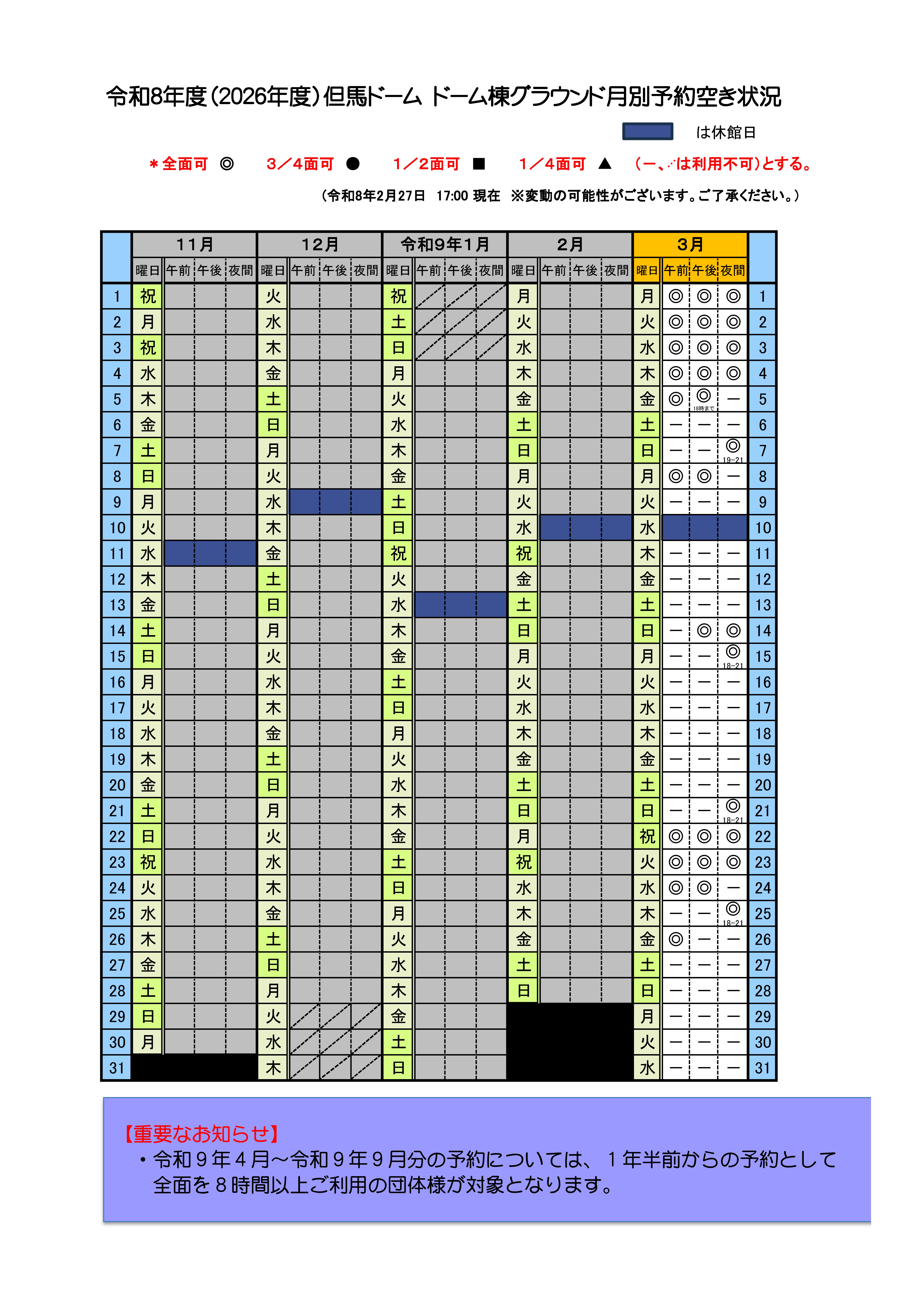 【令和8年3月~令和9年3月 ドーム棟グラウンドの空き状況】