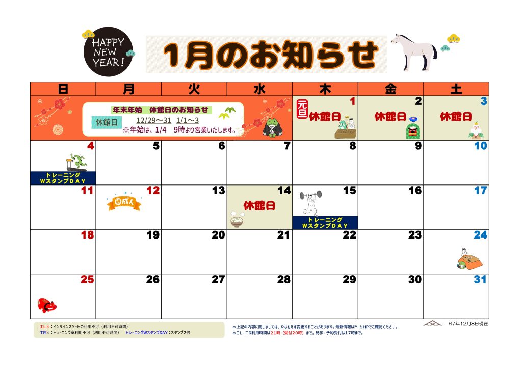 1月の「インラインスケート」、「トレーニング室」の使用可能日をまとめたチラシをみなさんにお届けします。ぜひ、ご覧ください。