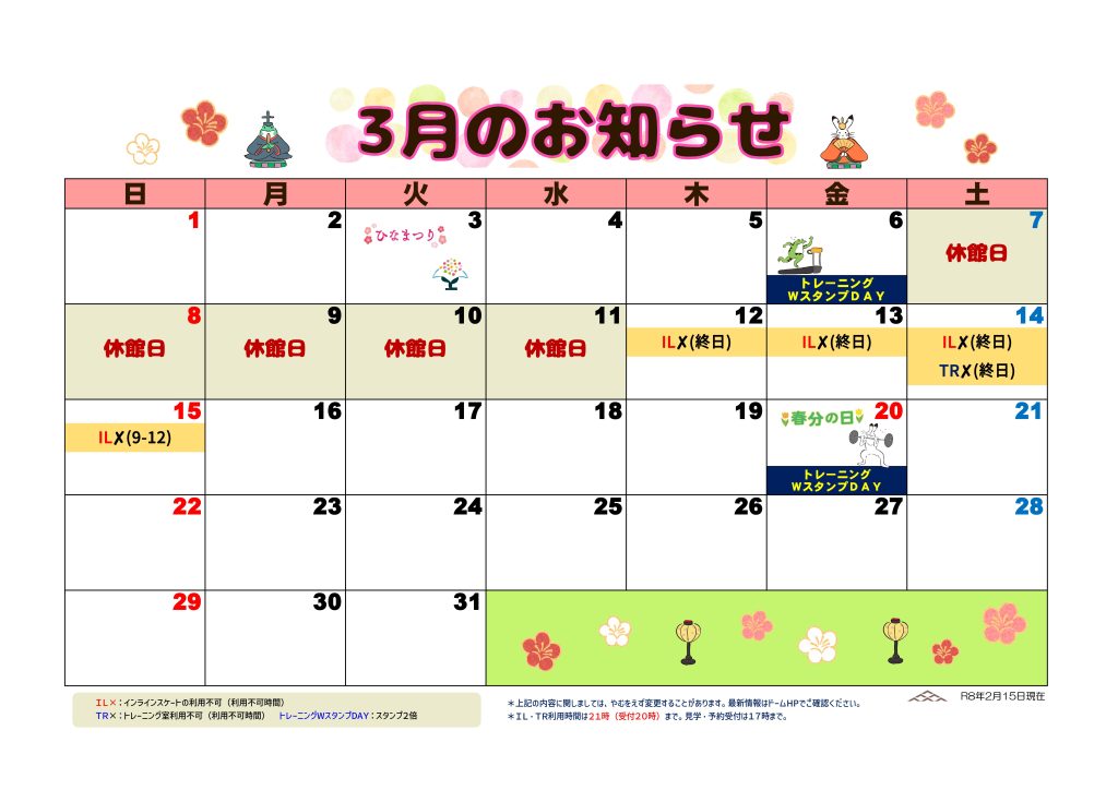 3月の「インラインスケート」、「トレーニング室」の使用可能日をまとめたチラシをみなさんにお届けします。